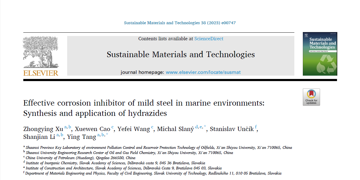 近日,beat365与中国石油大学(华东)、斯洛伐克科学院合作在能源环境领域国际权威学术期刊《Sustainable Materials and Technologies》(IF=9.6)发表题为《Effective corrosion inhibitor of mild steel in marine environments: Synthesis and application of hydrazides》的论文。