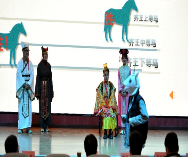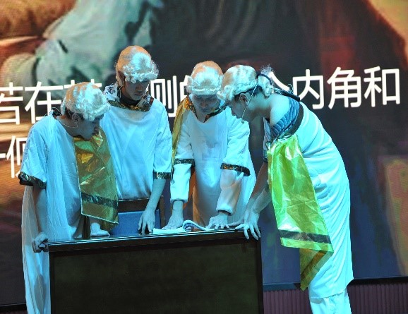 参加展演的16个节目分为课程实践作品与文艺节目两大类,来自10个院(系)的一百五十多位同学在舞台上展示了他们探究数学启蒙思想、对实际生活中建模的理解、对数学之美的发现。其中有根据数学家故事绘制的“数学漫画”、有结合数学原理制作的“古代建桥黑科技之超强承重筷子桥”、有用Python编写的函数动画;舞台剧《几何原本》漫溯历史长河、探索数学真谛,《王冠的秘密》《田忌赛马》以夸张幽默的表演再现经典数学故事;小品《数游长安》让数学问题和文化旅游巧妙碰撞;街舞《数学图像秀》尽显青春风采……。