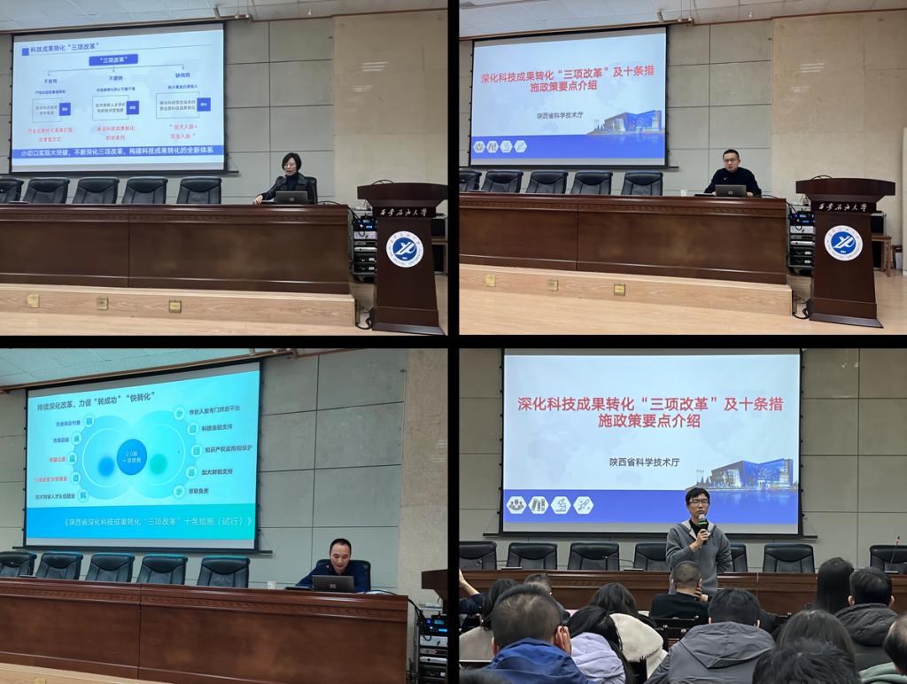 翟晓舟重点解读了科技成果转化“三项改革”的重点要求,逐条分析了陕西省深化科技成果转化“三项改革”十条措施,并引导有科技成果团队投身科技成果转化;李志如结合陕西科技大学深化“三项改革”、融入秦创原以来学校、教师所开展的工作和取得的效果,进一步强调陕西省“三项改革”政策红利和科技成果转化的良好机遇期;刘海鹏以科技成果转化全生命周期为主线,从知识产权成果到中试产品、最后到商业化的发展路线,介绍孵化器的各项功能以及金融资本引入助力企业发展的模式等;谢飞介绍了陕西省高校院所“三项改革”科技成果转化“以演代评”以及线上路演平台实施方案,并与参会老师互动,逐一回答了关于科技成果转化过程中的工作认定、创办企业时的资金支持、线上路演等相关问题。