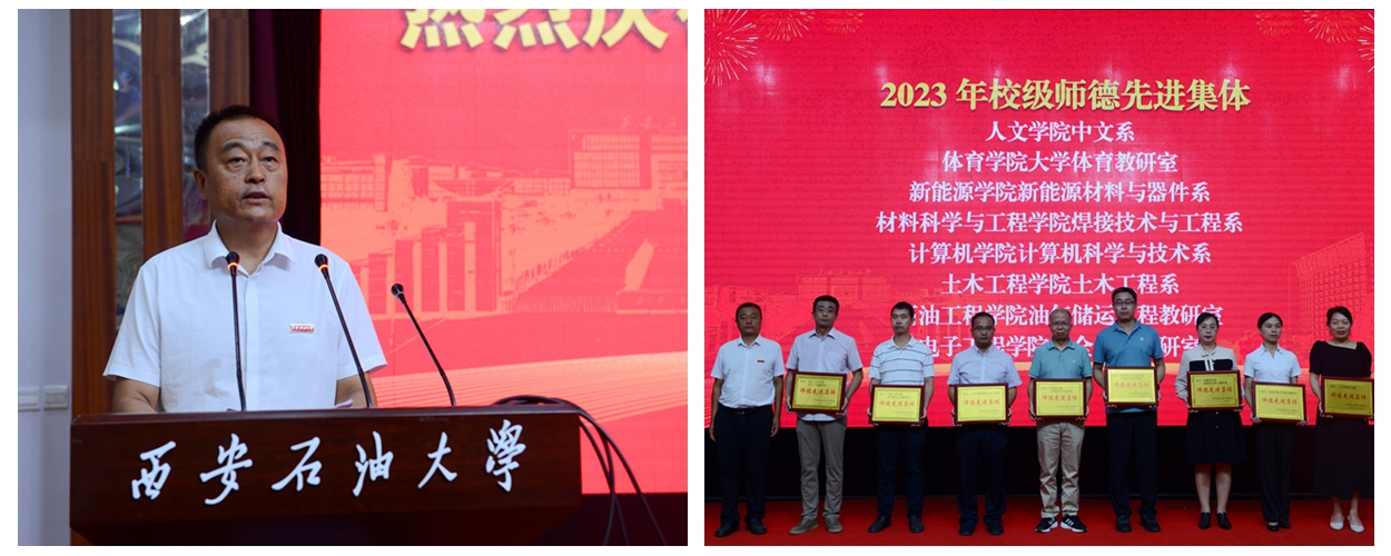会上,校党委书记赛云秀宣读了《教育部关于公布第三批“全国高校黄大年式教师团队”创建示范活动入围名单的通知》《陕西省教育厅关于公布第二批陕西省高校黄大年式教师团队的通知》,并为获奖团队颁奖;校长李天太宣读了《教育部关于公布第二批国家级一流本科课程认定结果的通知》和2021-2022年度省科学技术奖获奖项目名单,并为获奖团队和个人颁奖;校党委副书记、纪委书记、监察专员李延平宣读了《陕西省教育厅关于表彰第十三届陕西普通本科高等学校教学名师奖获奖教师的通知》,并为获奖教师颁奖;校党委副书记张木宣读了《中共陕西省委教育工委 陕西省教育厅关于对2022年陕西学校思政课教师“大练兵”主题活动中表现突出教师进行表扬的通知》,并为获奖者颁奖;副校长杨战社宣读了《陕西省科学技术厅关于公布2022年度中青年科技创新领军人才、科技创新创业人才及2023年度青年科技新星入选人员的通知》,并为入选者颁奖;副校长程永清宣读了《中共beat365官方网站委员会 beat365官方网站关于表彰2023年师德建设先进集体和师德先进个人的决定》,并为获奖教师颁奖;副校长张荣军宣读了《中共beat365官方网站委员会 beat365官方网站关于表彰2023年优秀教师 先进教育工作者的决定》,并为获奖教师代表颁奖;总会计师樊晓民宣读了《beat365官方网站关于表彰奖励“教书育人30年”教师的决定》,并为获奖教师颁奖。