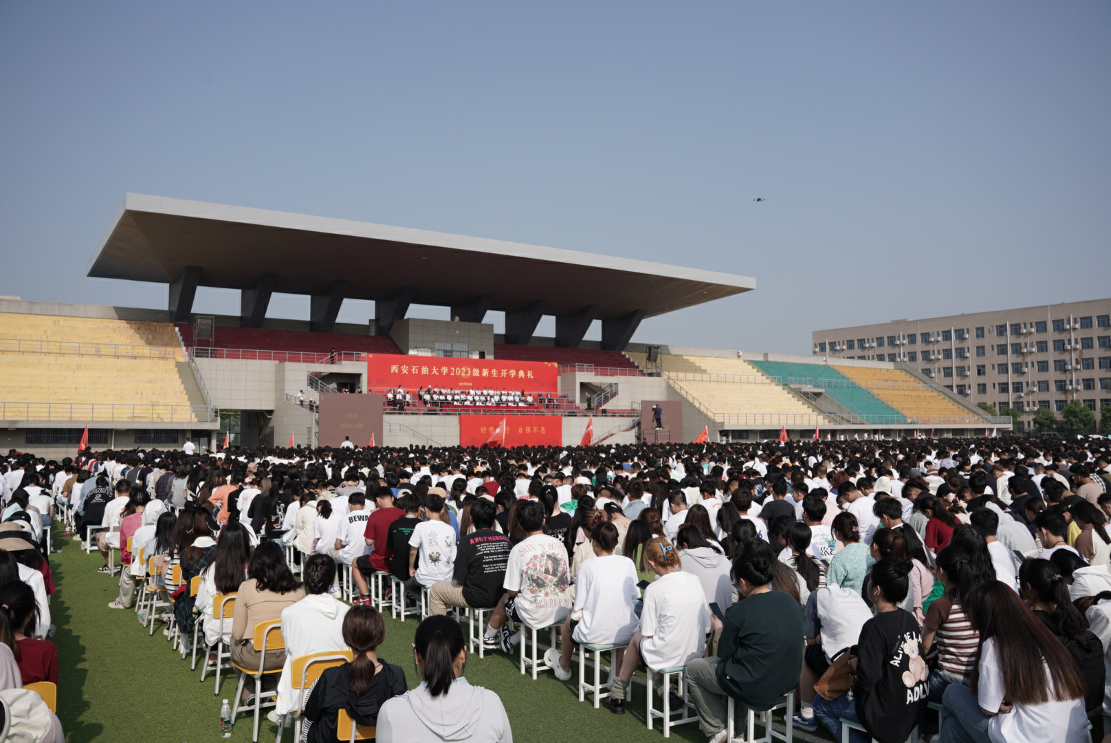 云天收夏色,木叶动秋声。9月8日上午,beat365在鄠邑校区东体育场举行2023级新生开学典礼。校党政领导赛云秀、李天太、张木、杨战社、程永清、张荣军、樊晓民出席大会。各院(系)及有关职能部门负责人、教师代表、2023级全体新生参加大会。大会由校党委副书记张木主持。