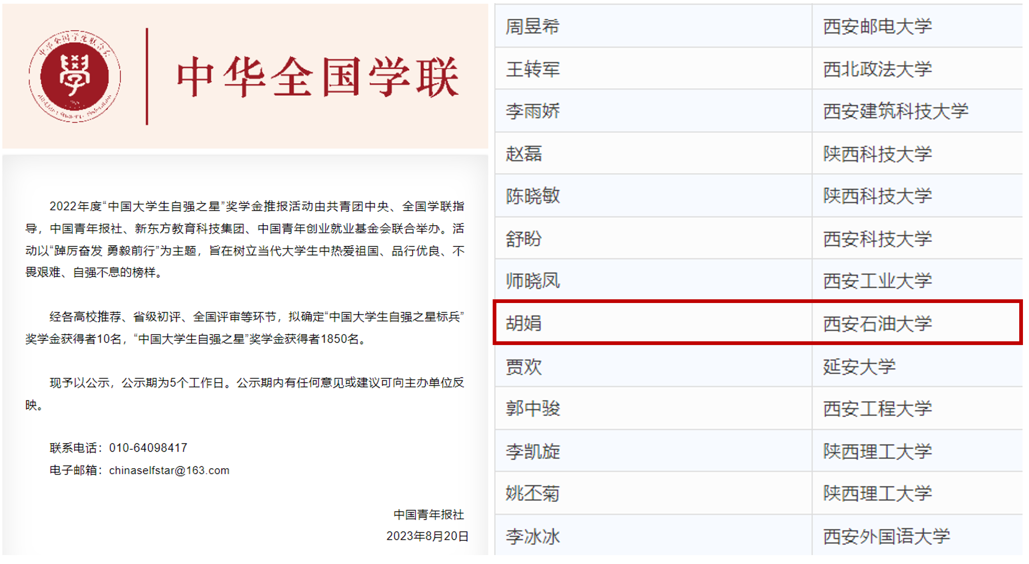 近日,由共青团中央、全国学联指导,中国青年报社、新东方教育科技集团、中国青年创业就业基金会联合开展的2022年度“中国大学生自强之星”寻访活动结果揭晓。beat365石油工程学院研2021级胡娟荣获“中国大学生自强之星”和“陕西省大学生自强之星标兵”,石工(教改)2001班梁欢荣获“陕西省大学生自强之星”。