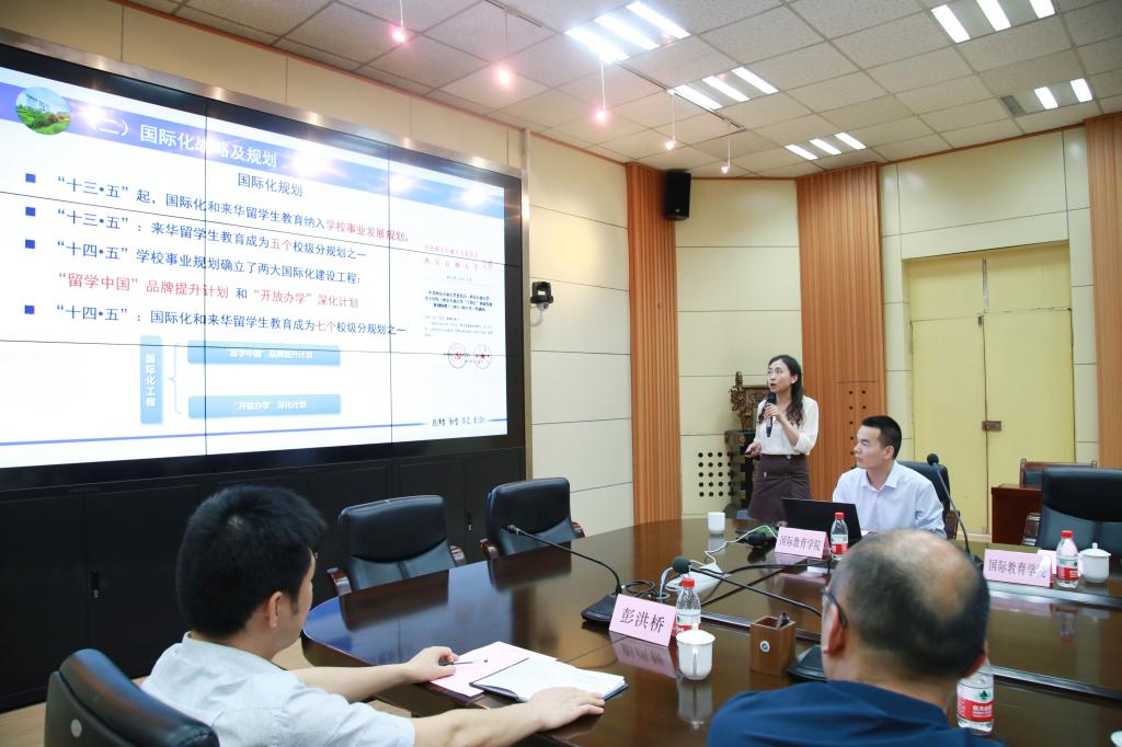 国际教育学院副院长秦璟详细介绍了学校国际化与来华留学工作的相关情况及近几年取得的成绩,其中beat365开展的中塔、中吉校企合作培养项目和牵头推动的土库曼斯坦“鲁班工坊”建设项目,得到了侨联一行的高度关注和赞赏。