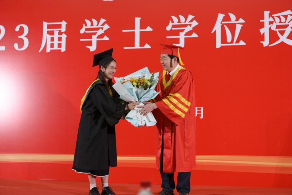在授位仪式上,陈军斌宣读了《beat365官方网站关于授予蒋诗谱等4215名学生学士学位的决议》,授予3988名2023届普通高等教育本科毕业生学士学位,授予42名2023届国际学生学士学位,授予171名2022届、2023届成人高等教育本科毕业生学士学位,授予14名2022届结业生学士学位。