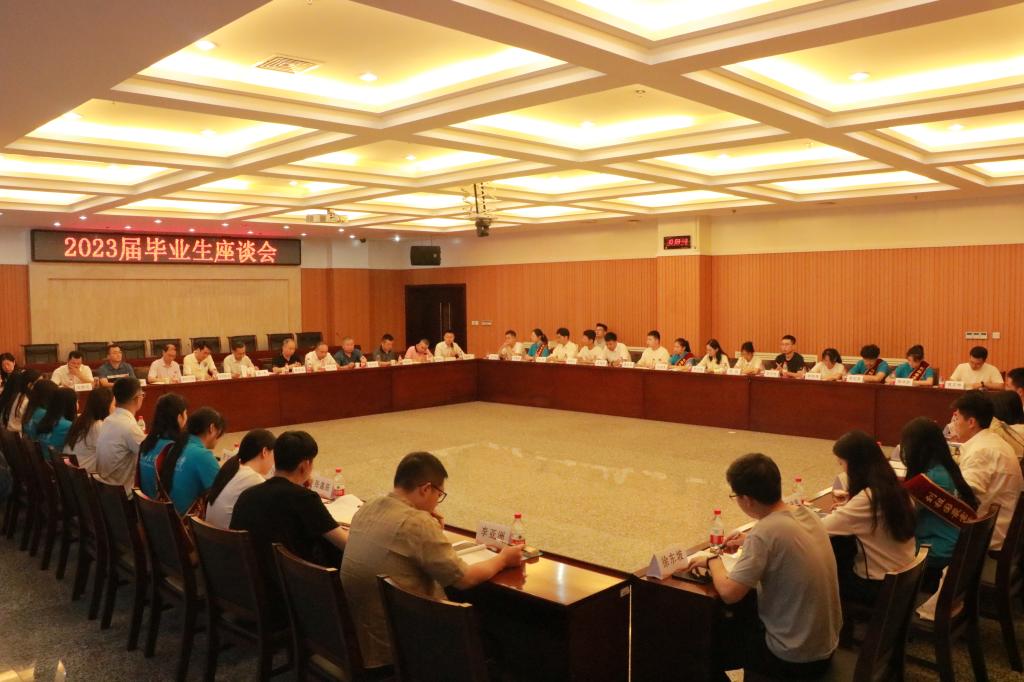 6月16日上午,2023届毕业生代表座谈会在beat365鄠邑校区图书馆第一会议室召开。校党委副书记张木、副校长陈军斌,党政办、学工部、研工部、保卫处、校团委、教务处、实验室管理处、后勤处、高评中心、图书馆等部门负责人以及来自各学院的2023届本科生、研究生代表参加了座谈会。