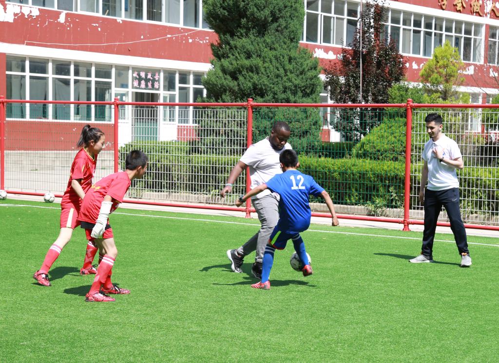 在直罗小学,留学生们为小学生们带来了有趣生动的英语口语课。实践教学活动是“感知中国”活动重要组成部分,在互动课堂上,小学生们与来自不同国家的留学生互动交流,来自马来西亚的咏翰分别用中文、英文、马来西亚语给小学生们教了生日祝福歌,来自哈萨克斯坦的小云用图画、猜谜游戏为小学生们上了一堂生动活泼的英语课。有趣的英语课堂激发了小学生学习英语的热情和浓厚的兴趣,课堂气氛热烈,同学们发言踊跃,一节课下来小学生们意犹未尽。英语课堂外,是以“传播快乐足球”为主题的足球互动活动,留学生与小学生们开展了一场足球友谊赛。场上,参赛队员们齐心协力,奋勇拼搏。带球、护球、传球、射球,动作娴熟,拼劲十足。就这样,初次来到直罗小学的留学生们感受到了当地的风土人情,并对接下来与孩子们的相遇充满了期待。活动中,beat365专程为直罗小学带去了50本捐赠图书和5个崭新足球。