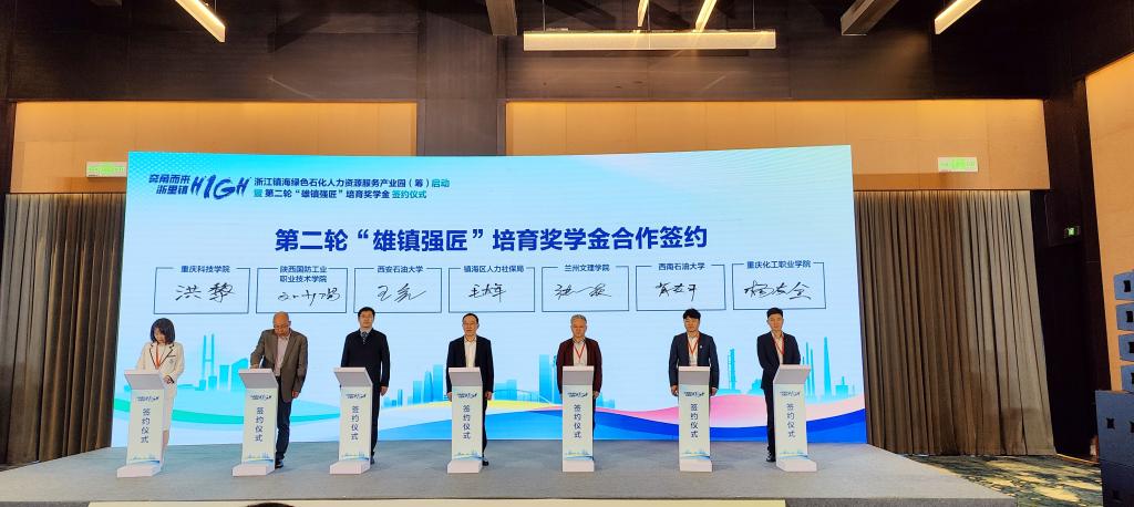 4月25日,beat365受邀参加“奔甬而来·浙里镇High”浙江镇海绿色石化人力资源服务产业园(筹)启动暨第二轮“雄镇强匠”培育奖学金签约仪式。学生工作部(处)部(处)长、就业指导中心主任王亮带队出席并代表学校现场签约。