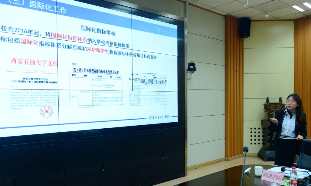 审查说明会上,国际教育学院(丝路能源学院)负责人作学校来华留学生教育及再认证自评自改工作汇报。