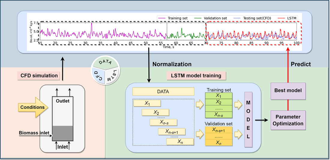 该研究成果基于精准的生物质流化床快速热解CFD模拟数据,结合深度学习模型开发了一种基于长短期记忆神经网络的CFD模拟智能加速方法。该方法能够快速预测反应器出口的产品流率,在保证足够高预测精度的前提下降低至少30%的CFD计算需求,同时对不同工况均具有良好的适用性。研究成果为流化床生物质快速热解反应器的智能设计优化提供了一条重要途径,能够促进生物质资源高效利用技术的开发及应用,有助于我国“双碳”目标的实现。