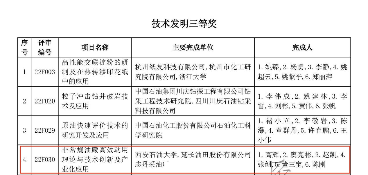 刘顺教授参与完成的“非常规储层双暂堵压裂改造关键技术与应用 ”荣获中国石油和化学工业联合会科技进步一等奖。高辉教授团队主持完成的“非常规油藏高效动用理论与技术创新及产业化应用 ”荣获中国石油和化学工业联合会技术发明三等奖。张益教授团队主持完成的“鄂尔多斯盆地非常规气藏高效开发关键理论与技术”和黄兴副教授团队主持完成的“CO2提高油气采收率与地质埋存关键理论技术创新及应用 ”两项成果荣获中国石油和化学工业联合会科技进步三等奖。