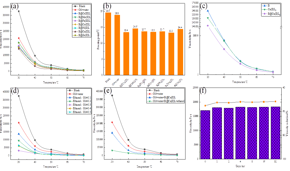 在本论文中,该团队使用水杨酸作为配体制备的金属配合物作为外源催化剂,粘土作为原位催化剂的代表,模拟了外源和原位催化剂形成的复合物,考察了它们在水热裂解中的协同催化降粘性能。粘土-水杨酸合铜复合物的催化剂效果最佳,并体现出外源和原位催化剂的协同催化效应。0.2 wt%催化剂和30 wt%乙醇供氢剂在180℃反应4h,降粘率达到91.5%,温度比传统反应温度低70℃左右。