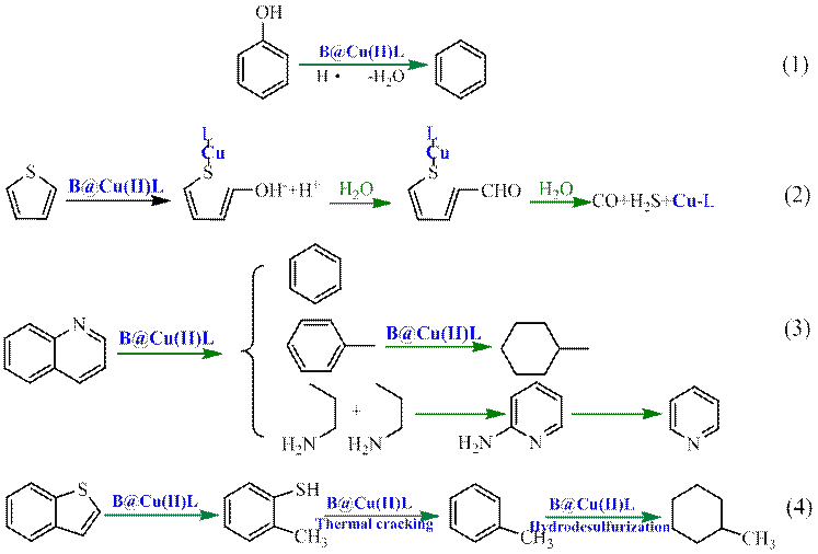 对反应后稠油的组分研究表明,稠油中的大分子化合物在反应后裂解为低沸点的小分子,胶质和沥青质含量减少,饱和烃和芳香烃含量增加。利用苯酚、噻吩、喹啉、苯并噻吩等模型化合物研究了稠油中分子可能发生的反应,证实了反应过程中稠油大分子中的C-C、C-N和C-S键的断裂,提出了粘土-水杨酸合铜复合物催化反应的机理。