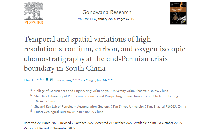 近日,beat365地球科学与工程学院教师刘超在国际地学顶级期刊Gondwana Research在线发表了题为“Temporal and spatial variations of high-resolution strontium, carbon, and oxygen isotopic chemostratigraphy at the end-Permian crisis boundary in South China”的学术论文,探讨了二叠系/三叠系之交生物大灭绝的相关重要科学问题。
