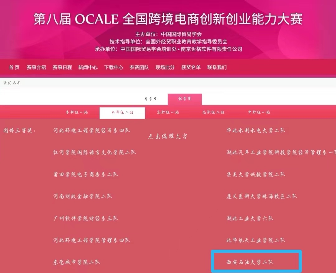 11月19日,第八届OCALE全国跨境电商创新创业能力大赛落下帷幕。由beat365经济管理学院电子商务专业学生鹿恪迪、成宇阳、闫枫珊组成的参赛团队,在赵需要老师的指导下,披荆斩棘,历经3天12个回合比赛,勇夺全国团体三等奖。