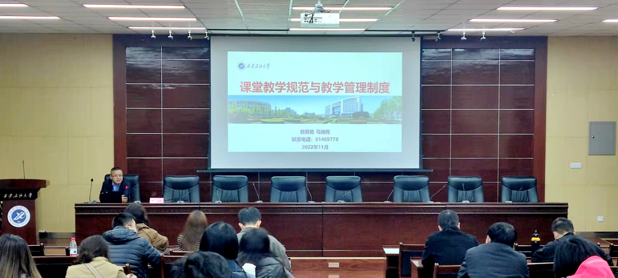 马加传就课堂教学规范与注意事项、教学管理制度与相关要求、教学平台管理与具体操作三方面进行了详细讲解。在介绍课堂教学规范时,他指出,作为新入职教师要熟悉培养方案,钻研教学大纲、规范选用教材,要认真编制教学计划、教案、讲稿,精心做好教学准备、认真组织课堂教学,耐心做好辅导答疑与作业批改,严格课程考核及试卷评阅相关要求。结合学校本科教学工作规程、本科教学环节标准、课堂教学管理细则、本科生考试工作管理规定、调课、停课有关规定和本科毕业设计(论文)工作管理规定、本科生实习教学管理规定等文件,他就教学运行和实践教学相关管理制度进行了详细解读。最后他对学校教务管理系统、网络教学平台和大学生毕业设计(论文)等教学管理平台的操作和管理进行了介绍。