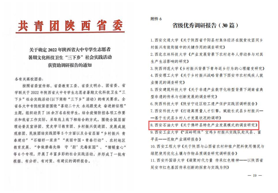近日,由陕西省委宣传部、省委文明办、省委教育工委、团省委、省学联等单位联合组织开展的“2022年陕西省大中专学生志愿者暑期文化科技卫生‘三下乡’社会实践活动”评选表彰结果揭晓,beat365荣获2022年“三下乡”活动省级优秀组织单位,地球科学与工程学院“十心石意援乡助农”社会实践队,电子工程学院“曦禾下乡”社会实践队被评为省级优秀团队。王莹、李政被评为省级先进个人。地球科学与工程学院《关于佛坪县特色产业发展模式的调查研究》调研报告获团省委专项资助。