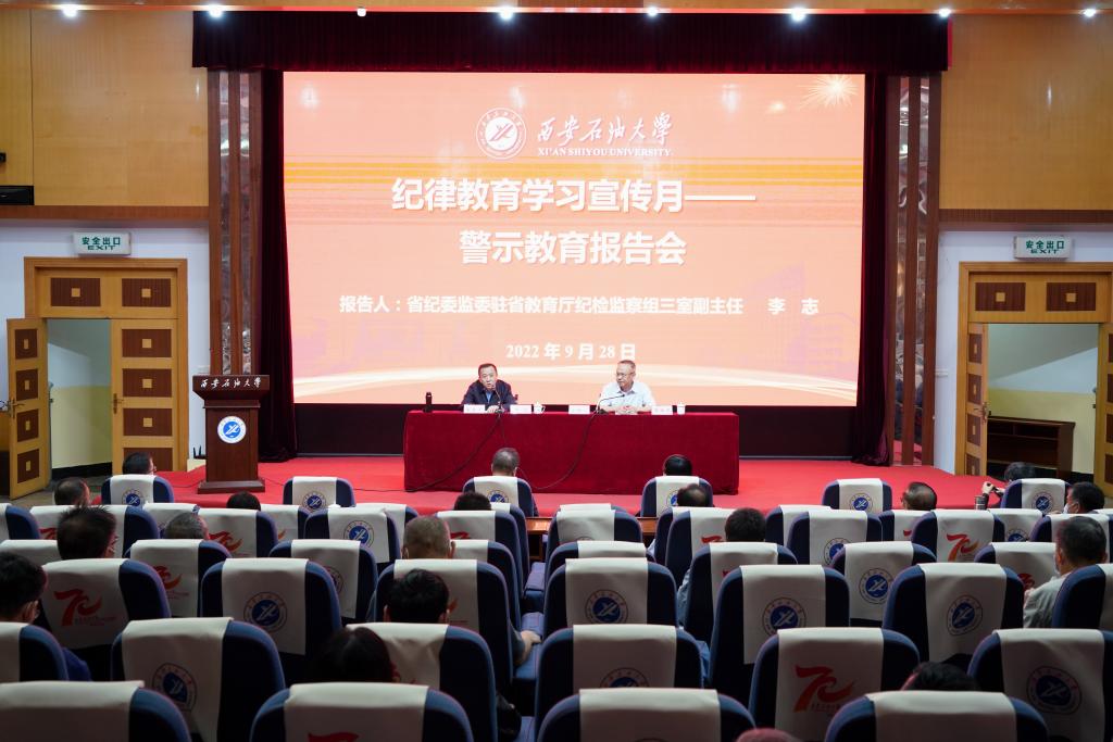 为深入学习贯彻习近平总书记关于全面从严治党的重要论述,认真落实校党委关于开展作风建设专项行动实施方案有关要求,进一步推进纪律教育学习宣传月活动,9月28日下午,学校纪委举办警示教育专题报告会。报告会在雁塔和鄠邑校区设立1个主会场和2个分会场,陕西省纪委监委驻省教育厅纪检监察组副组长张佳,校领导、全体处级干部、院(系)级单位党组织纪检委员、纪委(监察专员办公室)干部共160余人参加了报告会。报告会由校党委副书记、纪委书记、监察专员李延平主持。