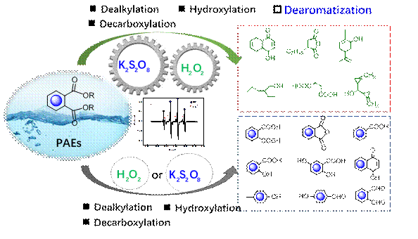 针对高等氧化方法中单一体系试剂消耗大、去除效率低、反应环境要求高等问题,开发了一种利用双氧化剂协同高效降解顽固污染物邻苯二甲酸酯的方法。通过简单的亚铁离子激发经济和环境相容的双氧化剂,达到“1+1˃2”协同效应,利用协同产生物种的可持续氧化能力,突破PAEs惰性芳环的转化,实现高效的去除效率。通过对比分析邻苯二甲酸酯非靶向产物,发现在两种单一氧化剂体系中的降解通过脱烷基化、羟基加成和脱羧作用,以芳香族化合物为主,而协同催化氧化体系中DMP能够突破去芳构化作用进一步深度氧化为脂肪族分子。氧化过程捕获的高强度的·OH和SO4•-支持导致双氧化剂对DMP可持续氧化能力以及高效降解作用。这项工作为协同活化高级氧化策略去除顽固有机污染物提供重要的思路与展望。