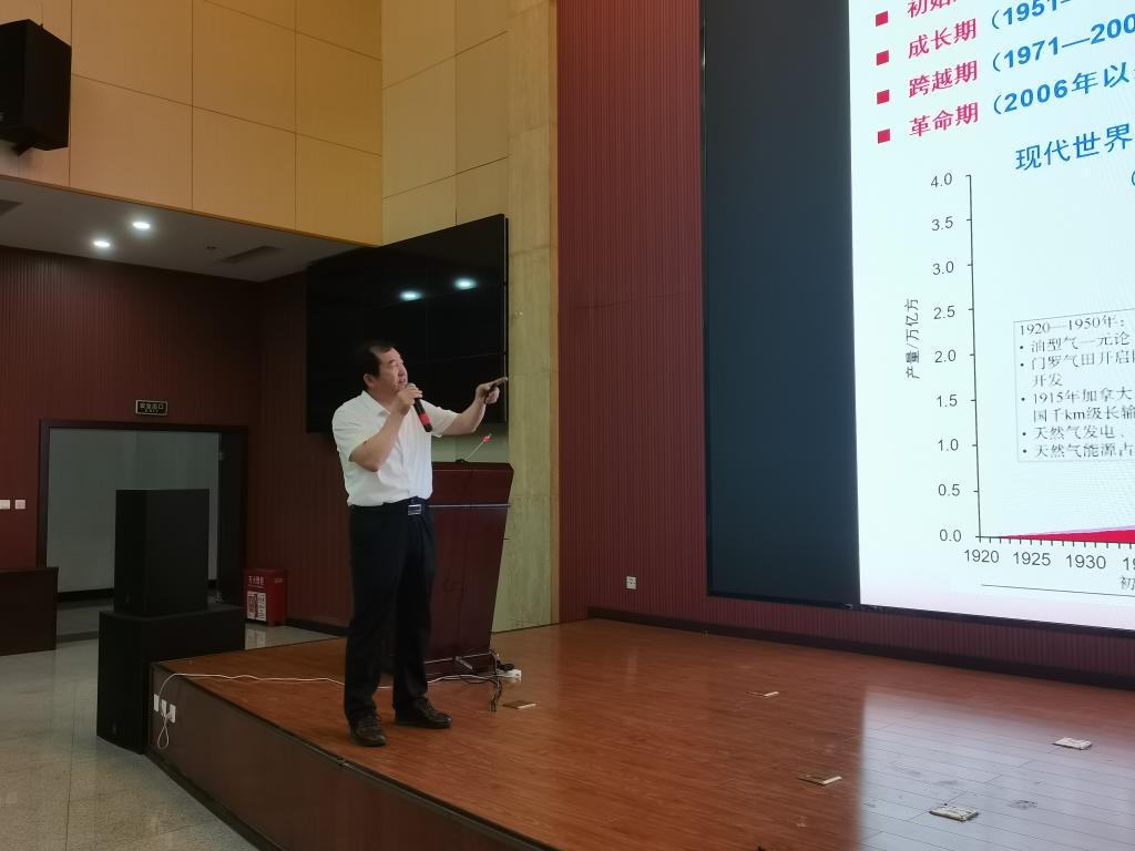 在授课中,李天太首先围绕习近平总书记对国家能源安全作出的批示指示精神、国家“双碳“目标和世界能源格局等方面,向在场师生介绍了学校成立新能源学院、土木工程学院的背景以及必要性。随后分别介绍了世界油气发展趋势和我国油气发展趋势。他以人类社会发展为主线,以能源科技革命为人类社会发展提供不竭新动力为切入点,通过详实的数据和大量的图表详细阐述了世界油气发展趋势和我国油气发展趋势,强调在我国目前能源战略和结构体系下,新能源将发挥保障国家能源战略“接替”与“主力”作用。最后,李天太结合自己30余年能源行业工作学习感悟,对新能源发展趋势作出展望。他希望新能源学院、土木工程学院的广大学子树立远大理想,努力学习、不负韶华,争取为保障国家能源战略安全作出贡献。