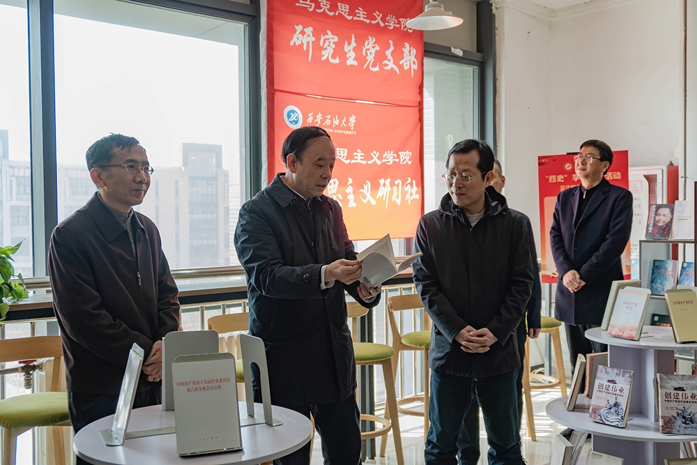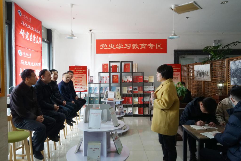 在鄠邑校区,指导组一行参观了铁人纪念馆、校史馆、马列书屋“党史学习教育专区”、实习认知园、省级石油石化虚拟仿真实验教学示范中心;现场观摩了beat365期刊中心主任郭岗彦讲授的“铁人精神”通识教育课《破解铁人之谜,解析精神密码》第一课堂教学演示,马克思主义学院教师张莉、学生王婉菲等开展的师生联学《从铁人精神中汲取奋进力量》第二课堂教学演示,以及工程训练中心综合实训室开展的VR现场教学演示;实地察看了“我为师生办实事”项目进展情况,了解学校在虚拟仿真实验教学与实践教学、体验教学有机融合方面作出的互联网下教育教学创新探索成效。在走访党史学习教育专区“马列书屋”时,指导组与beat365师生还就基层师生党支部党史学习教育开展情况作了现场交流。