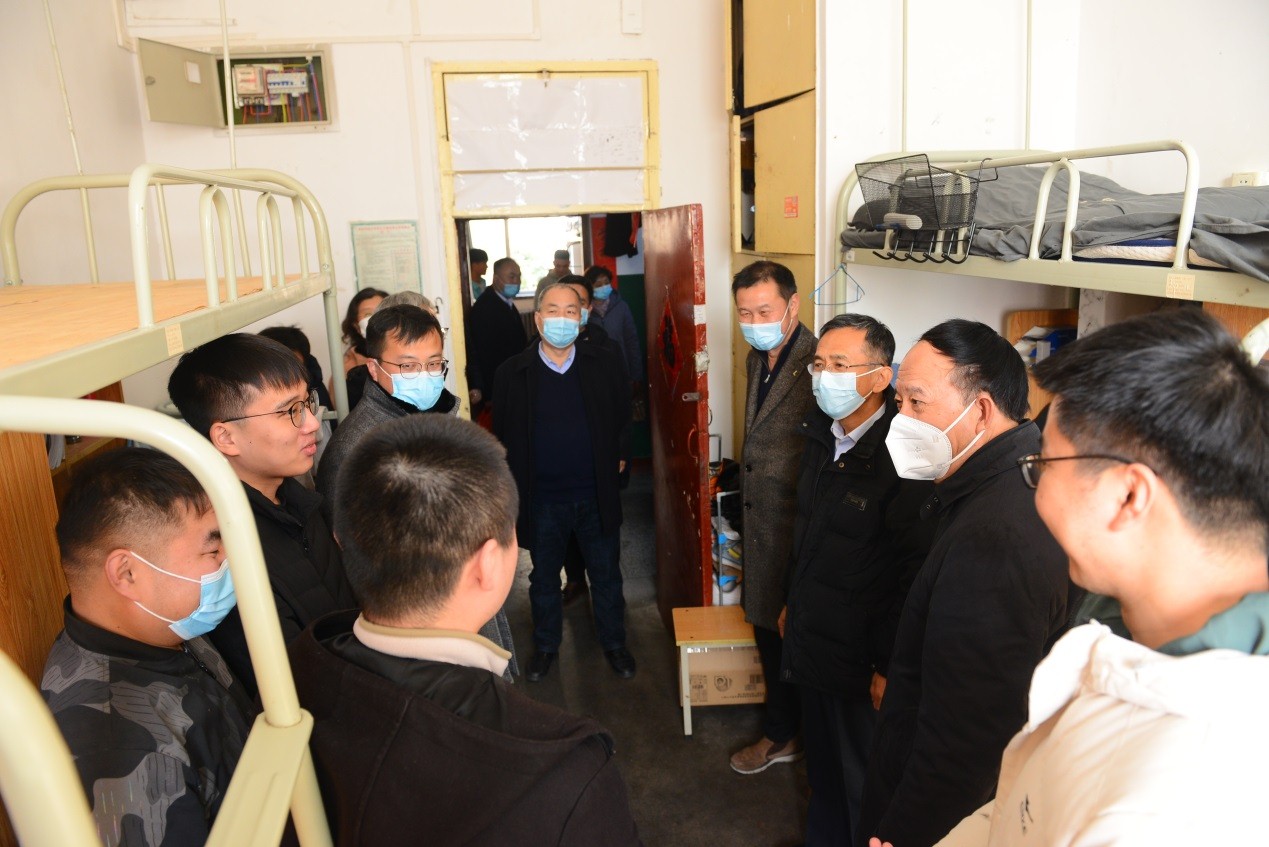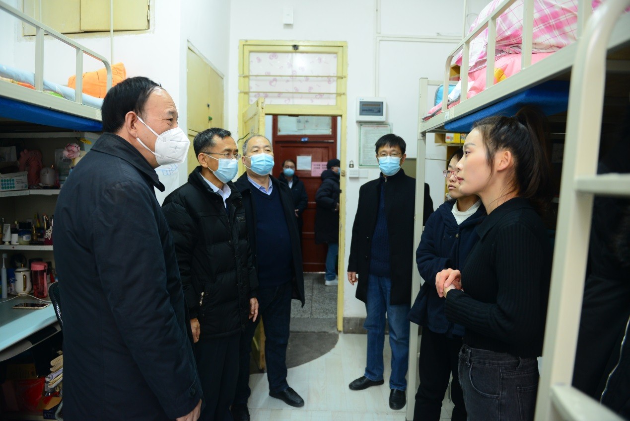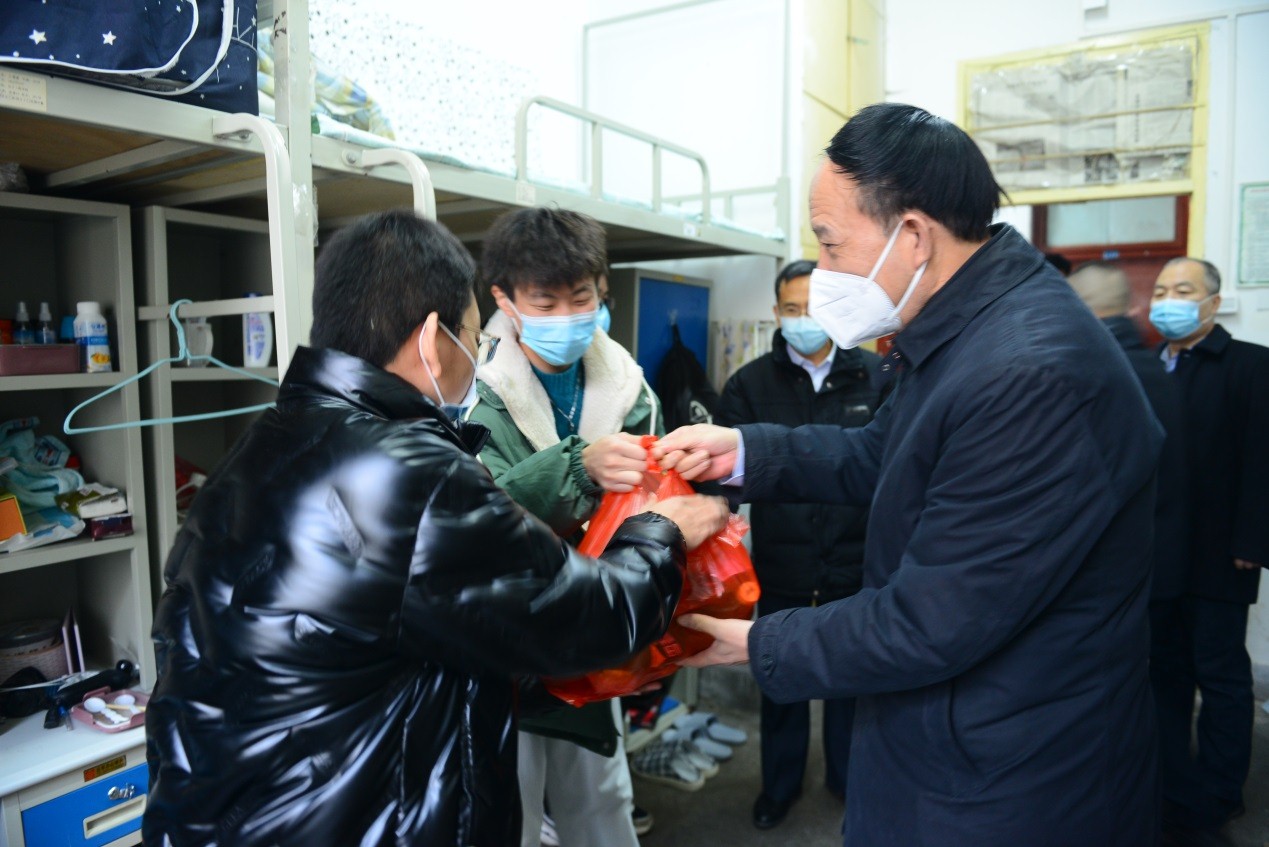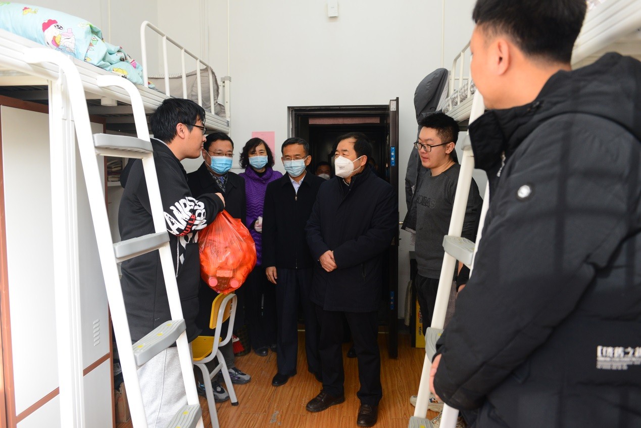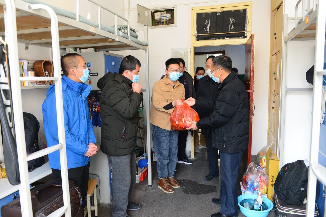 校领导们走进学生宿舍,与留校学生进行了亲切交流,询问了留校学生寒假学习、科研计划、家乡疫情等情况,叮嘱大家做好个人防护,充分利用假期提升自己。他们表示,学校非常关心留校学生,将全力为留校学生在校学习生活做好服务,确保寒假期间校园安全稳定,让大家度过一个平安、快乐、祥和的春节。