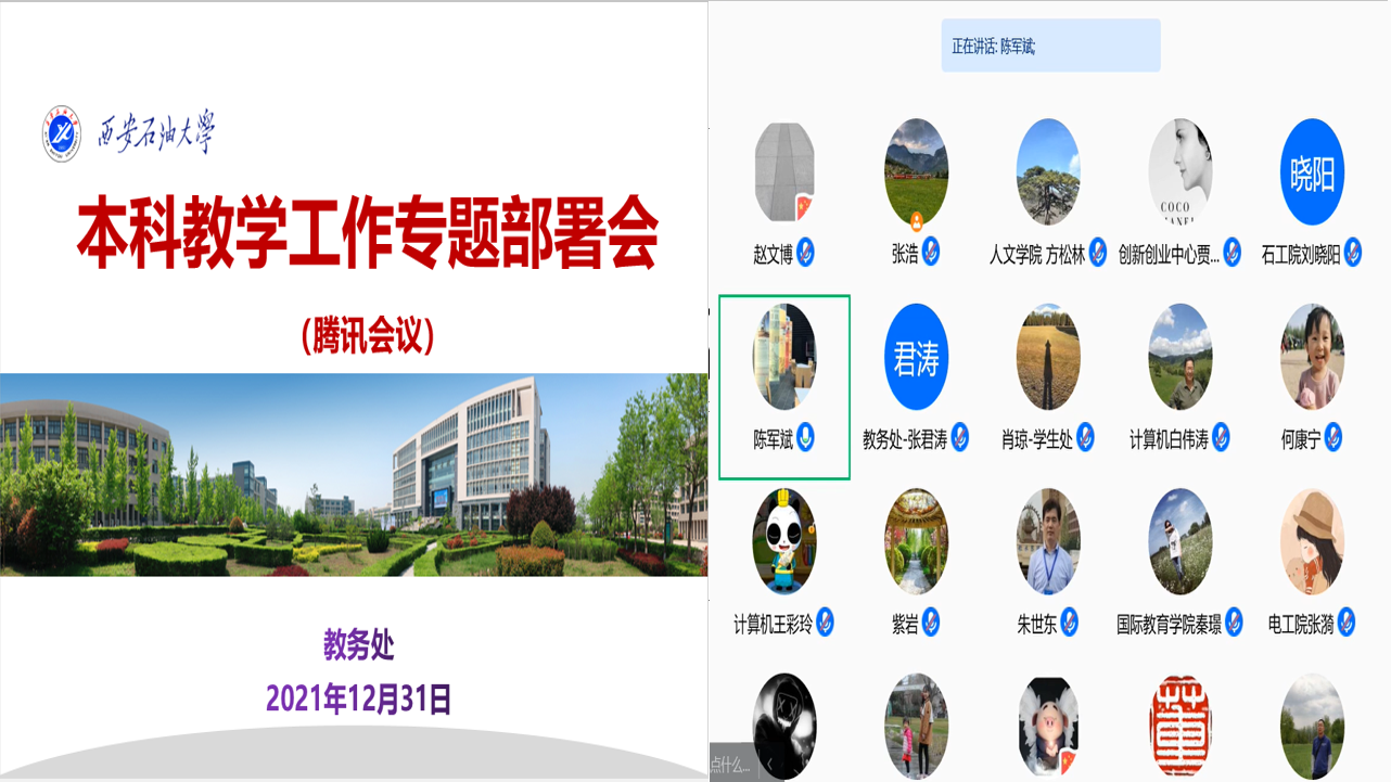 为深入贯彻全省教育系统疫情防控工作视频会议精神,落实学校疫情防控决策部署和工作要求,全力以赴做好疫情防控期间本科教学工作,保障本科在线教学平稳有序运行,2021年12月31日下午,学校疫情防控教学工作组召开了线上本科在线教学工作专题部署会。副校长陈军斌出席会议,学生工作部(处)、教务处、实验室管理处、创新创业中心、高教研究与评估中心负责人以及各院(系)主管教学院长(主任)、教学办公室主任参加会议。教务处处长张君涛主持会议。