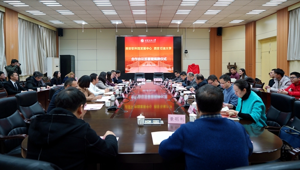 陈军斌副校长代表学校对西安软件园发展中心副主任张露一行来访表示欢迎,并简要介绍了学校近年来在人才培养、科学研究、师资队伍、社会服务等方面建设情况。他谈到,此次和西安软件园等相关企业签署合作协议,是深入贯彻国家产学研、产教融合的集中体现,是深化落实国家关于高校毕业生全方位、多视角就业的具体举措,有利于健全高校政产学研协同育人机制,有助于学校培养面向社会,面向市场,适合社会发展需要的人才,进而实现双方合作育人、合作就业、合作发展。双方要持续挖掘契合点,不断创新合作模式,扩大合作范围,打造深层次校企合作平台,在人才培养、基地建设、教材建设、培养方案修订等方面取得深度合作和无缝对接,进而实现“双赢”。