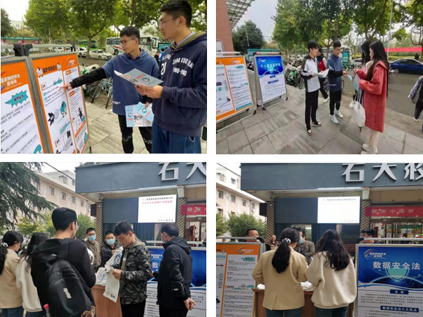 10月12日,学校下发了《关于积极参与2021年国家网络安全宣传周校园日活动的通知》,号召全校师生积极参与2021年国家网络安全宣传周校园日系列活动。校园活动日当天,学校分别在雁塔校区和鄠邑校区校车乘车点、食堂等人流量大的区域放置展板,发放布袋、知识手册等多种宣传资料千余份,发送网络安全宣传短信4000余条。