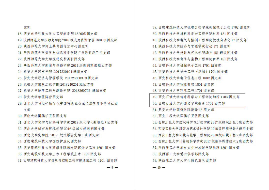 近日,共青团陕西省委、中共陕西省委教育工委公布了《关于全省首批新时代高校团建示范创建结果的通报》,beat365石油工程学院团委、化学化工学院团委通过“全省高校团建标杆院系”验收,地球科学与工程学院勘探1703团支部、外国语学院翻译1701团支部通过“全省高校团建样板支部”验收。