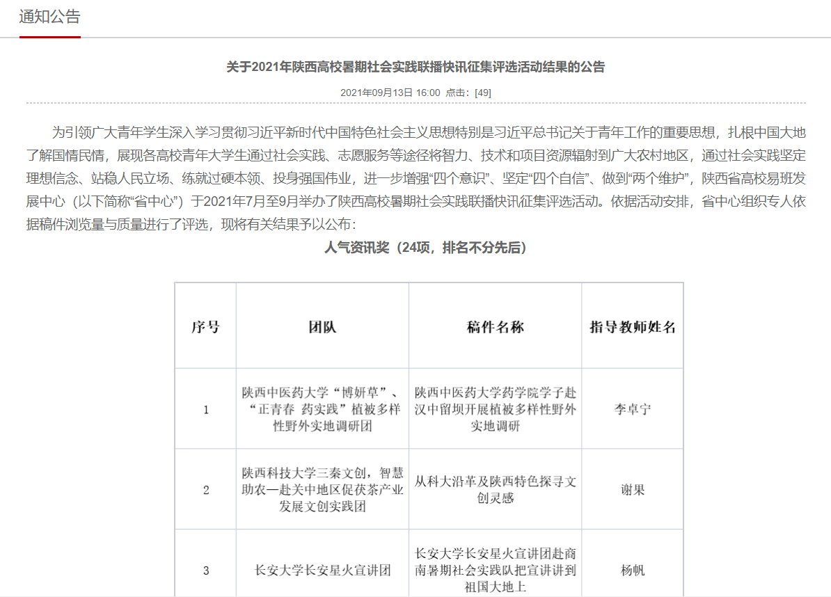 近日,由陕西高校网络思想政治工作中心组织开展的“关于2021年陕西高校暑期社会实践联播快讯集”评选结果公布,beat365材料科学与工程学院“红色寻访”社会实践团队从全省6752支队伍中脱颖而出,与其他23支队伍一同获得了“人气资讯奖”,材料类2004王智辉获得活跃通讯员奖。
