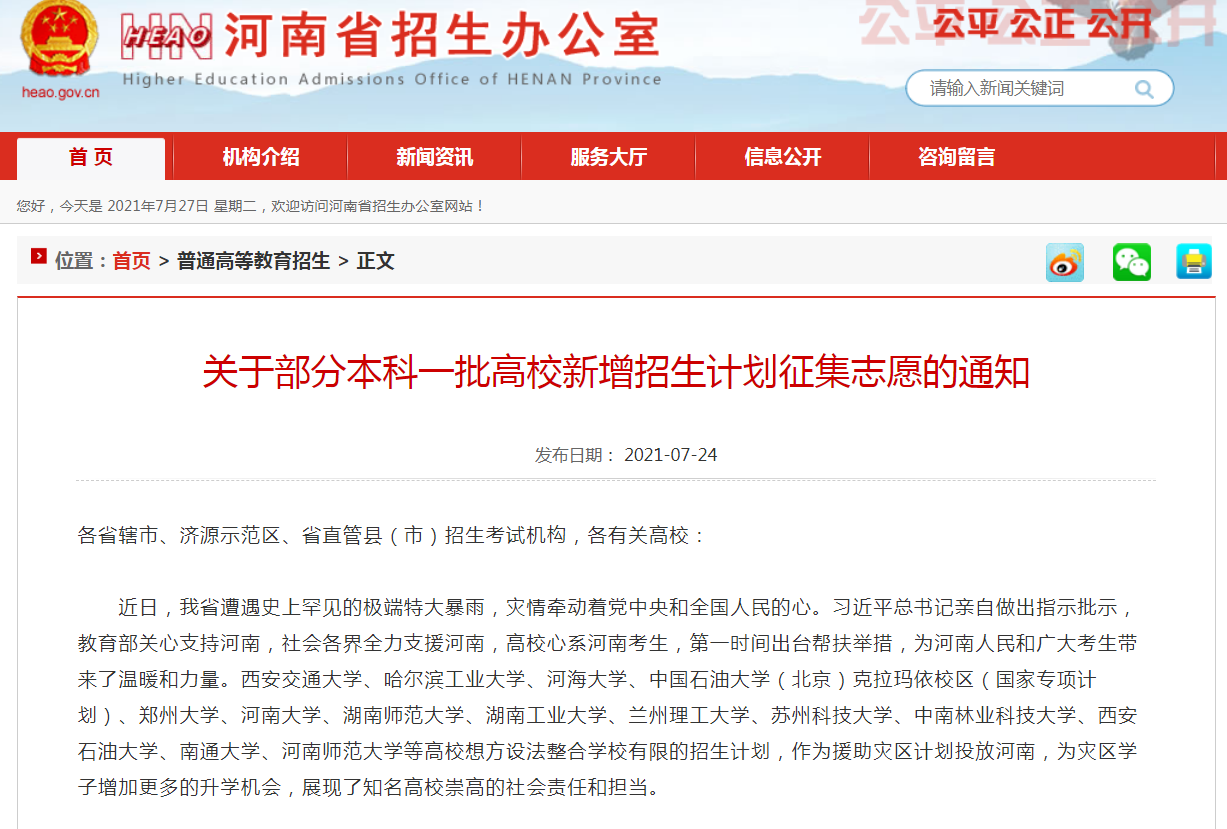 近日,河南省遭遇史上罕见的极端特大暴雨,灾情牵动着党中央和全国人民的心。习近平总书记亲自做出指示批示,教育部关心支持河南,社会各界全力支援河南。beat365官方网站也心系河南考生,第一时间出台关心帮扶举措,整合学校有限的招生计划,紧急调拨3个本科一批救灾专项招生计划(机械设计制造及其自动化2个、计算机类1个)投放河南,为灾区学子增加更多的升学机会,以实际行动支援河南。