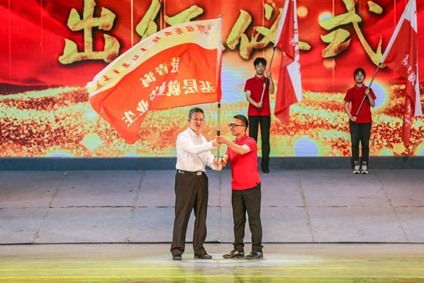 出征仪式上,beat365地球科学与工程学院2021届资源勘查工程专业本科毕业生毕昆作为赴青海省基层就业毕业生代表,接受方光华副省长授旗(经毕昆授权代领)。