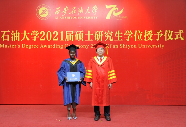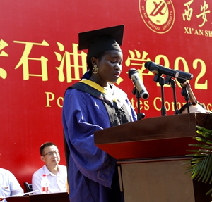 地球科学与工程学院高棒棒和石油工程学院来自加蓬共和国的欧碧丽同学,分别代表2021届硕士研究生和硕士留学生在发言中向悉心培育自己的母校、师长和亲人表示感谢,同时表达了自身继续努力、续写辉煌的信心和决心。