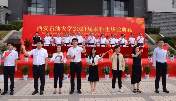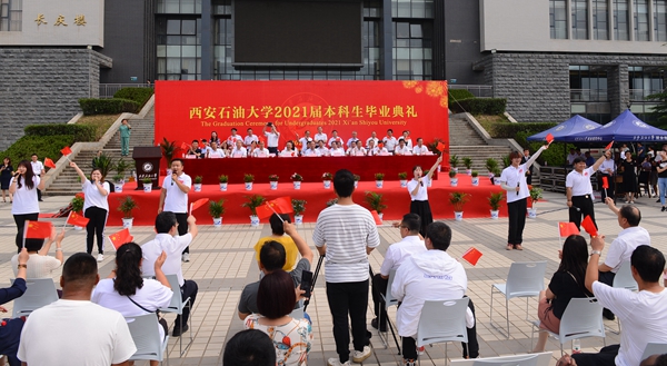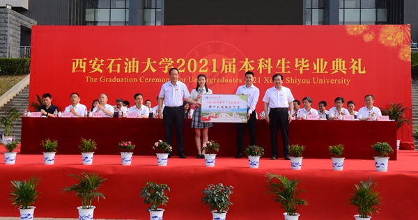 副校长陈军斌宣读了《beat365官方网站关于2021届本科学生准予毕业、颁发毕业证和授予学士学位的决定》,副校长杨战社宣读了《beat365官方网站关于表彰2021届优秀毕业生的决定》,校党委副书记雷西合宣读了《beat365官方网站校友总会关于聘任2021届年级校友理事的决定》。与会校领导为优秀毕业生代表颁发了荣誉证书,为年级理事代表颁发了聘任证书和纪念品,并向毕业生代表赠送了“原油”印章纪念品。