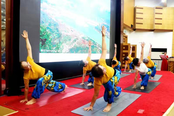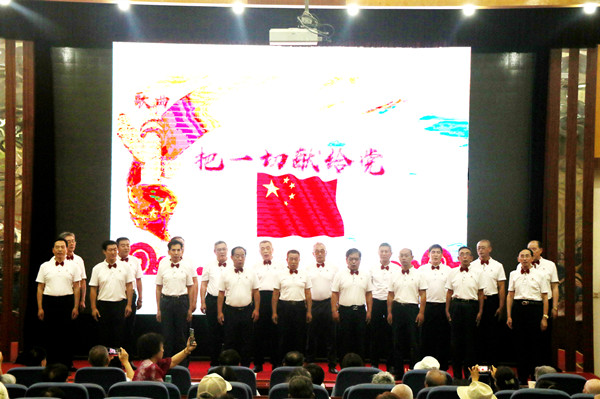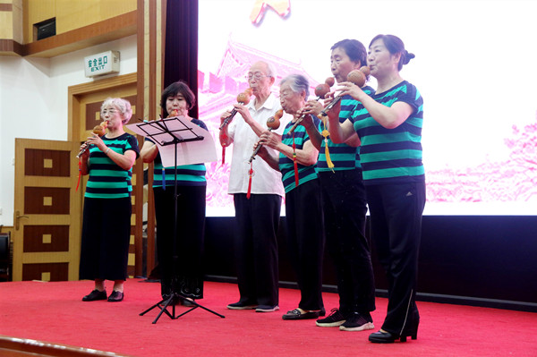 之后,老年大学的学员们和离退休教职工为大家带来了精彩的文艺节目。演出在开场舞《唱支山歌给党听》中拉开了帷幕。老年大学女子合唱队带来的女声小合唱《没有共产党就没有新中国》《中国一定强》,合唱团男生小合唱《把一切献给党》,合唱团女生小合唱《洪湖浪花》《天使的声音》,葫芦丝乐团的联奏《红歌联奏》等节目,充分展示了老年大学的教学成果和老同志热爱党、热爱生活的良好精神面貌。黄放明老师京剧清唱《朝霞映在阳澄湖上》,老年大学瑜伽协会带来的瑜伽表演《人间第一情》、冯原、汉泽西等老同志带来的诗词朗诵《人民万岁》《西石大赋》,展示了离退休教职工的多才多艺。文艺演出最后,beat365原校长张宁生教授领唱,老年大学合唱团60多名团员共同演唱的《不忘初心》《我家在中国》,将老同志、老党员对伟大祖国的热爱汇集成流淌的歌声,祝福伟大的祖国繁荣昌盛,祝福伟大的党永远不忘初心,将现场气氛引向高潮。