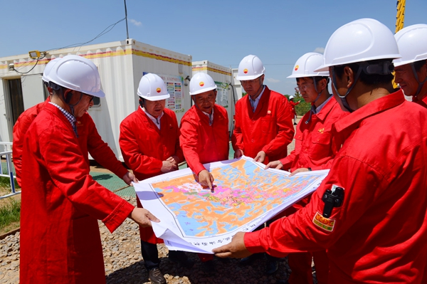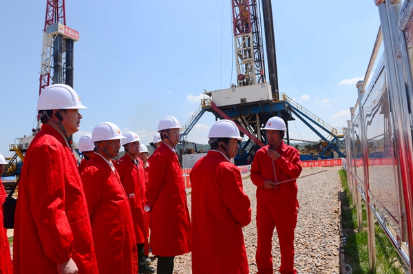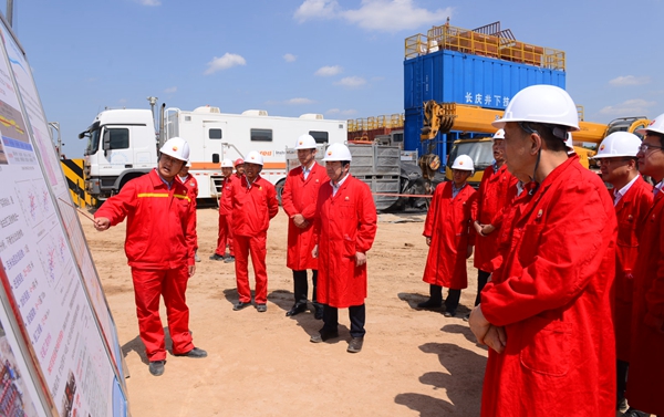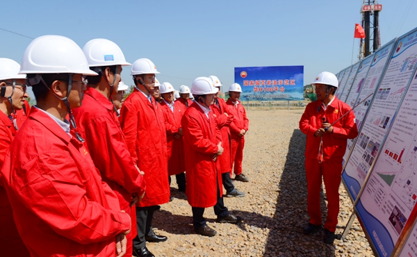 李校长一行首先参观了位于甘肃省庆阳市庆城县的陇东国家级页岩油示范区华H100平台。陇东国家级页岩油示范区是长庆油田二次加快发展、推动油气持续上产的重要接替区域,页岩油产能建设项目组以规模建产、效益开发、绿色生产、技术攻关为导向,加大前端技术研究分析,强化生产组织,把控关键环节,全力推进页岩油高效勘探开发。华H100平台通过深化地质研究,精细小层对比,优选平面、纵向“甜点”,全部实现大井丛部署。目前,该平台实行工厂化作业,5部钻机快速钻进,计划在6月底全部完钻部署任务,为中国共产党百年华诞献礼。