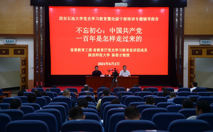 根据省委教育工委、省教育厅统一部署,结合学校年度干部培训工作安排,6月2日上午,省委教育工委省教育厅宣讲团走进beat365,开展党史学习教育暨处级干部培训专题辅导报告会。宣讲团成员、陕西师范大学陈答才教授以《不忘初心:中国共产党一百年是怎样走过来的》为题,在雁塔校区学术报告厅作报告。校党政领导李延平、张木、陈军斌、李华、苏文甫、程永清、樊晓民等出席报告会。报告会由校党史学习教育领导小组副组长、校党委副书记雷西合主持。