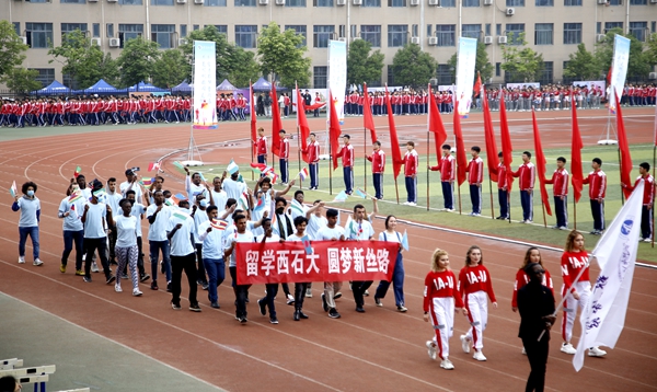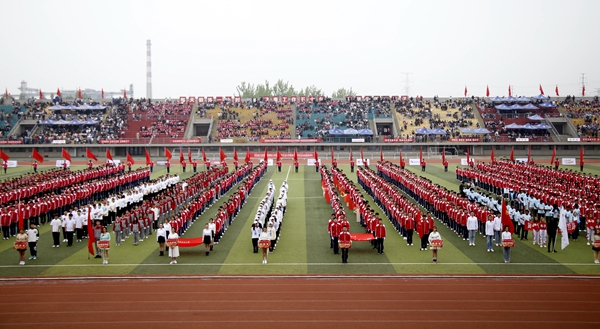 上午8点30分,伴随着铿锵有力的运动员进行曲,国旗、校旗、会徽队,裁判员方阵和13支参赛代表队有序通过主席台接受检阅。入场仪式上,beat365师生精神抖擞、生气勃勃,展现了奋勇进取的精神面貌。各个方阵途经主席台时,纷纷表达了对建党100周年、建校70周年的美好祝愿,表示了要用健康与智慧担当起新时代责任的决心。