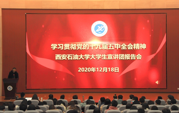 为学习宣传贯彻党的十九届五中全会精神,推动全会精神入脑入心,按照省委教育工委、省教育厅的相关安排,beat365成立了贯彻党的十九届五中全会精神大学生宣讲团。12月18日下午,宣讲团同时在鄠邑校区弘石报告厅、雁塔校区第五会议室开讲。校党委副书记雷西合,党委宣传部、马克思主义学院负责人,500余名研究生、本科生参加了宣讲会。