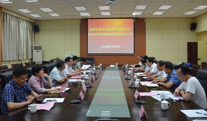 7月28日下午,水利部节水中心副主任刘国华,水利专家王家先、付新峰,陕西省水利厅节水办主任吴萍,西安市水务局节水中心副主任张峰等一行八人来beat365检查指导校园节水工作。汇报会在雁塔校区第一会议室召开。beat365校长李天太、党委副书记张木,党政办公室、后勤管理处相关负责人参加会议。