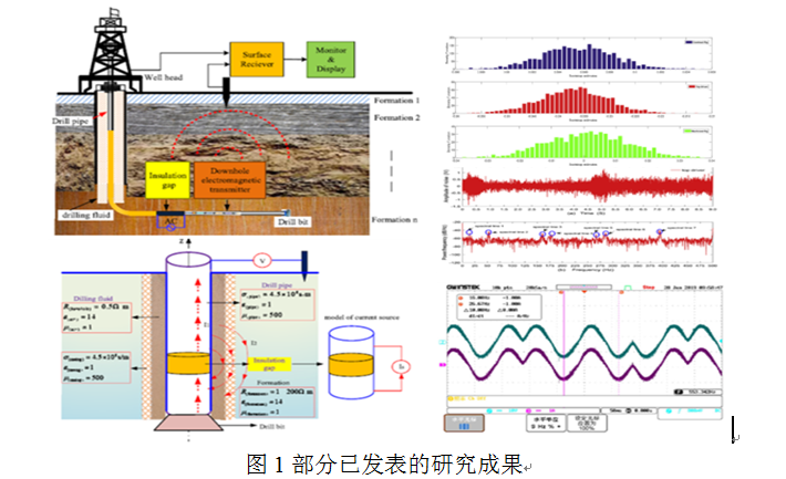 针对上述关键问题,刘科满教授课题组开展了井下电磁发射技术、地面信号接收处理技术、井场噪声处理技术等研究领域的科技攻关,图1为部分已发表的研究成果。其中,课题组研制的井场噪声采集、分析与评估系统,利用Bootstrap方法和Welch方法评估了不同钻井工艺、不同钻机、不同钻进状态时的井场的噪声统计特性,为进一步认知井场噪声的统计规律,建立噪声分布模型奠定了良好的理论基础,也为改进、优化电磁随钻测量、近钻头随钻测量、随钻地震勘探等测量仪器提供了重要的理论支撑。课题组研究获得国家自然基金(面上)项目和陕西省科技攻关项目的资助。