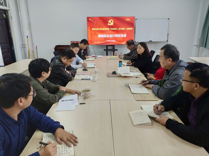 11月18日下午,樊晓民总会计师以《抢抓机遇,努力工作,推动外国语学院更好更快发展》为题,在雁塔校区第一教学楼706室为外国语学院党委理论学习中心组全体成员讲授了专题党课。外国语学院党政领导班子、理论中心组成员、教工党支部书记参加了会议,会议由学院党委书记蔡强主持。