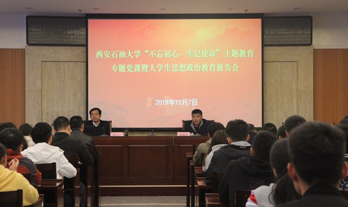 根据“不忘初心、牢记使命”主题教育部署安排,11月7日下午、8日下午,校长李天太以《坚定信念勇于担当立志成才》为题,分别在鄠邑校区、雁塔校区为本科生、研究生讲授了主题教育专题党课暨思想政治教育报告会。本科生报告会由鄠邑校区管理办公室主任覃彪主持,研究生报告会由研究生工作部部长高荣芳主持。