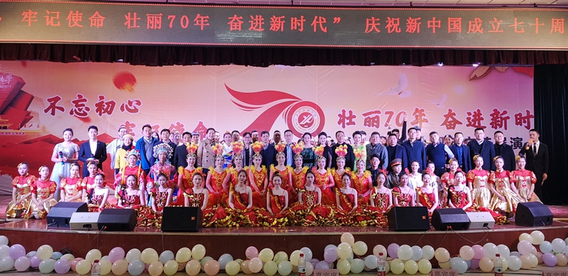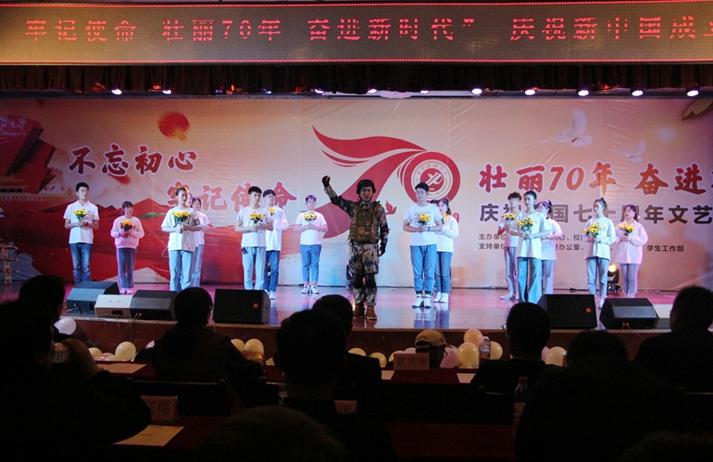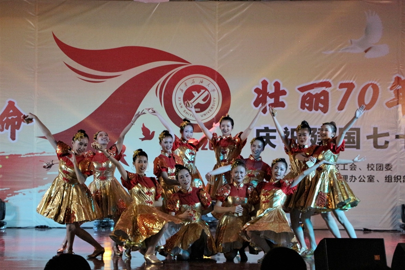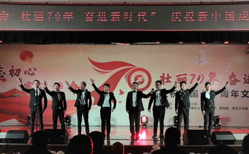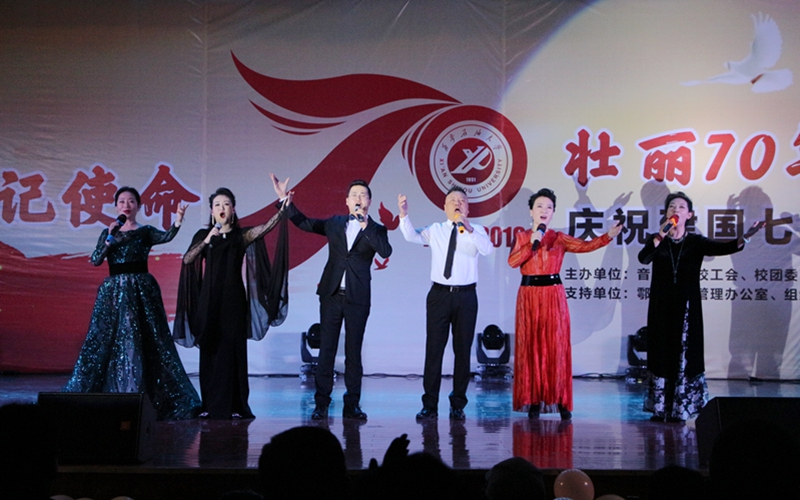 为深入开展“不忘初心、牢记使命”主题教育,10月26日晚,由音乐系、校工会、校团委主办,鄠邑校区管理办公室、组织部、宣传部、学生工作部支持的“不忘初心、牢记使命,壮丽70年、奋进新时代”庆祝新中国成立七十周年文艺展演在鄠邑校区腾辉大学生活动中心举行。校党委副书记雷西合、副校长杨战社、副校长程永清出席活动。相关部门负责人及鄠邑校区600余名学生观看了晚会。