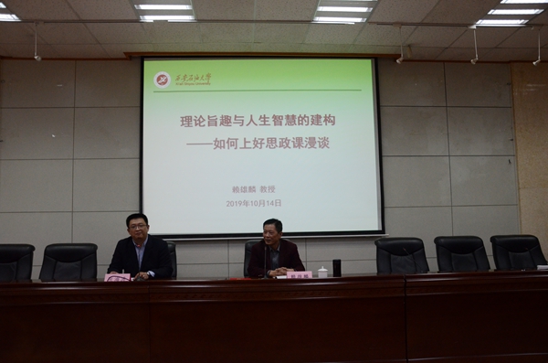聘任仪式结束后,赖雄麟教授为马院师生作了题为《理论旨趣与人生智慧的建构——如何上好思政课漫谈》的学术报告。他从我们为什么需要思想政治教育、思想政治教育的性质、如何上好思想政治教育三个方面进行了精彩地讲解,并与参会师生进行了互动交流。