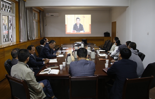 校党委理论中心组全体成员在行政楼二楼会议室集中收看