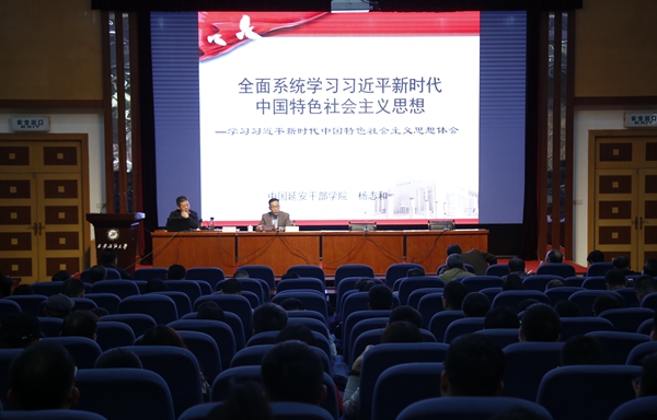 杨志和教授在题为《全面系统学习习近平新时代中国特色社会主义思想》的报告中,全面系统地解读了习近平新时代中国特色社会主义思想的精神实质,将习近平总书记系列重要讲话精神概括总结为“一个主题、一个目标、一条红线、一个理念”。报告以中国特色社会主义观、民族复兴观、全面改革观、科学发展观、民主政治与法治观、意识形态观、国际战略观、党建观这“八大观”为逻辑脉络,详细阐述了深入学习领会习近平新时代中国特色社会主义思想的重大理论意义和实践意义。