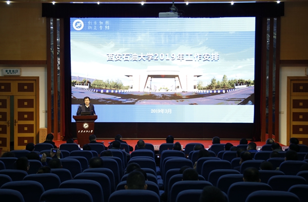 下午的会议由校长李天太主持。会议首先由规划处、教务处、科技处、研究生院(学科建设办公室)、学生工作部(处)、后勤管理处等6个职能部门和石油工程学院、地球科学与工程学院、马克思主义学院、经济管理学院等4个学院主要负责人就落实学校2019年工作任务进行大会交流发言。