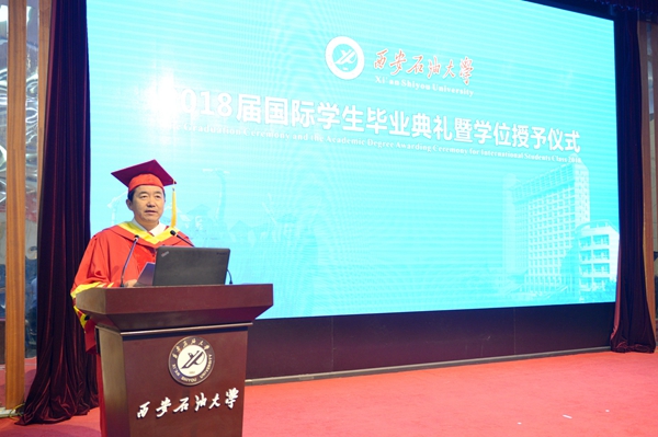 教务处副处长易和平、研究生院副院长屈文涛分别宣读了获得学士学位、硕士学位的国际学生名单。学生工作处副处长齐仲锋、国际教育学院院长董皓分别为2018届优秀国际学生毕业生、国际校友理事颁发了证书和聘书。