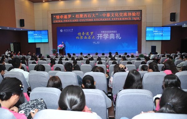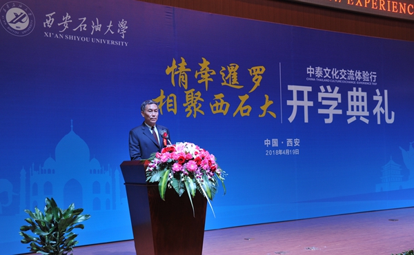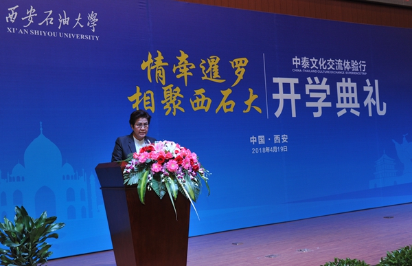 4月19日上午,beat365在鄠邑校区弘石报告厅隆重举行“情牵暹罗•相聚西石大——中泰文化交流体验行”项目开学典礼。泰国萨拉武力府教育厅厅长维拉彭·德才、泰国教育部第二教育区主任拉蒂玛·帕尼查弩芭、泰国教育部特殊教育局局长苏达·素妩,陕西省教育厅副厅长赵昶葆、beat365校长屈展出席开学典礼。泰国中学校长代表团一行17人、参加体验行活动的172名泰国师生以及beat365百余名人文学院师生参加了系列活动。副校长陈军斌主持仪式。